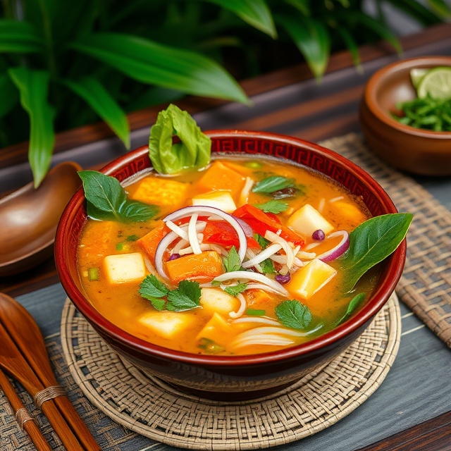 מרק ירקות תאילנדי שהוא חיבור מושלם לאהבה של בעלי למטבח התאילנדי. המנה הזו מביאה את הטעמים הנפלאים והניחוחות האקזוטיים שהוא כל כך אוהב – מתיבול קוקוס-בוטנים ועד אטריות האורז הנימוחות. עם המתכון הזה, כל ארוחה הופכת לטיול קטן בתאילנד!