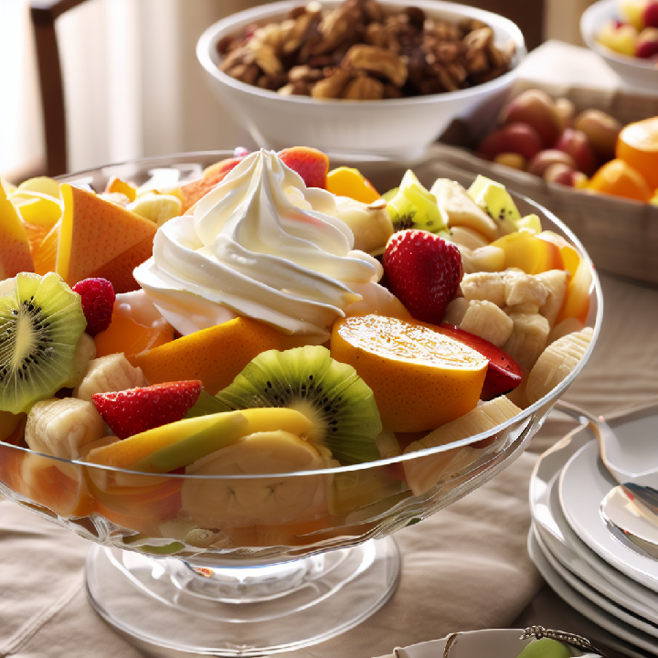 סלט פירות מרענן ועשיר, המשלב בננות, תפוזים, תותים, קיווי ואגס, בתוספת אגוזי מלך קצוצים ונגיעה של וניל. מושלם לארוחת קיץ קלילה, עם עיטור של קצפת ריצ' המעניקה סיום מתוק.