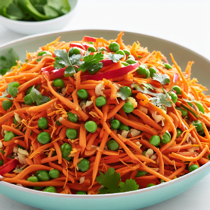 סלט קליל ומרענן שמלא בטעמים – גזר מגורר עם שום, זנגביל ופלפלים, בתוספת אפונה ורטב לימון. מושלם לארוחה קלילה או כתוספת צבעונית לכל שולחן.