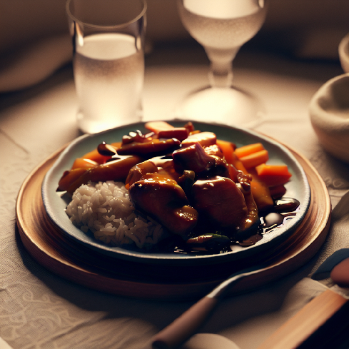 נתחי חזה עוף עסיסיים מוקפצים עם רצועות בטטה וגזר בווק, בתיבול אסייתי של שום, ג'ינג'ר ופלפל צ'ילי חריף. המנה מוגשת חמה על מצע אורז לבן ומעוטרת ברוטב סויה מתקתק ומעט חומץ בלסמי. מושלם לארוחה מהירה וטעימה